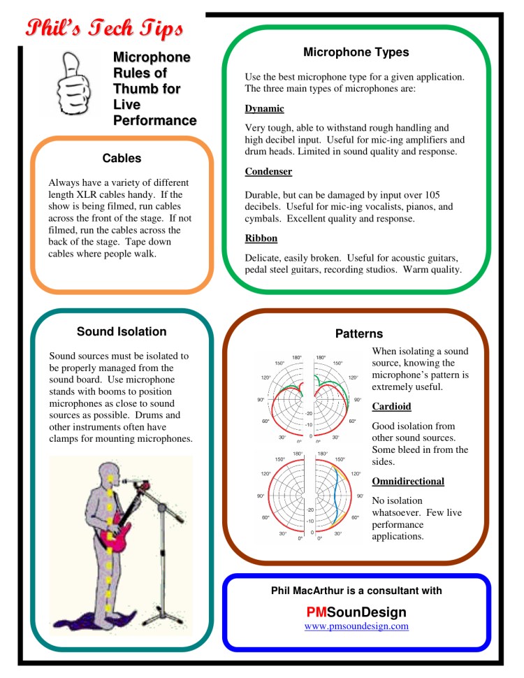 This sheet is targeted for new sound techs. The real estate on the page is constrained, so I picked the four points – Microphone Types, Patterns, Cables, and Sound Isolation – as they are crucial to sound reinforcement, they are all pertinent to the use of microphones, and they can be illustrated in a single page. In each of these subject headings, I included only the most significant rules of thumb, due to space restrictions and the need for the document to be readable in minimal light. I chose the theme, “Microphone Rules of Thumb for Live Performance,” because there are no hard and fast rules for using microphones. Every live performance has its unique sound situations, and it is better to give sound techs rules of thumb, than it is to give them hard and fast rules that don’t work in all situations. Although its primary purpose is as a job aid, the Tech Tips sheet will also remind sound techs that I am available for consulting.